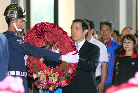 馬英九上午率領(lǐng)黨內(nèi)同志、臺北市長郝龍斌等人前往“國父紀念館”,紀念孫中山誕辰144周年。儀式在紀念歌歌曲聲中揭開序幕,馬英九獻花后,向?qū)O中山銅像行三鞠躬禮。