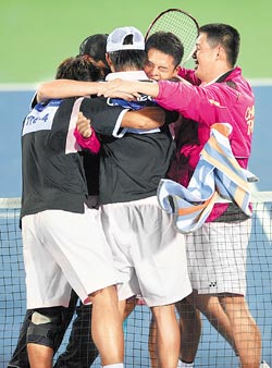 中新網11月15日電 據(jù)臺灣《中國時報》報道,中華臺北亞運代表團在廣州亞運會第二天收獲豐碩,上屆在金牌戰(zhàn)失手的軟式網球男子團體賽,昨日借著林鼎鈞與劉家綸在決勝點演出精采逆轉,以二比一后來居上擊敗日本隊,替中華臺北代表團奪得廣州亞運首金。