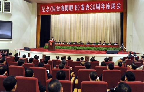 中新網(wǎng)北京12月31日電 紀(jì)念《告臺灣同胞書》發(fā)表30周年座談會31日上午在人民大會堂隆重舉行。中共中央總書記、國家主席、中央軍委主席胡錦濤出席座談會并發(fā)表重要講話。