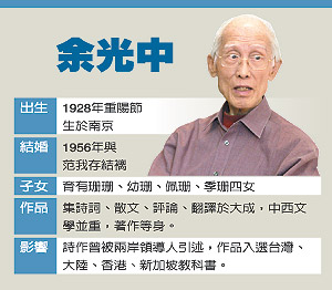 余家上上下下、里里外外,都范我存打理;余光中管理的,唯有一大方書(shū)案,與車子的方向盤(pán)。詩(shī)人不挑食、不挑衣,“太太弄什么,便吃什么;給什么,就穿什么!”