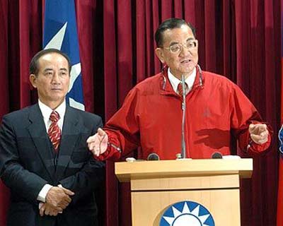 候選人連戰(zhàn)(中)傍晚召開記者會宣布所有競選造勢活動暫停,并促當局盡速公布陳水扁遭槍擊的細節(jié)。