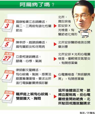 心臟學(xué)會(huì)秘書長、臺(tái)大醫(yī)院內(nèi)科主治醫(yī)師黃瑞仁指出,根據(jù)扁日前在北所接受心電圖檢查,發(fā)現(xiàn)他有心搏快速、心軸左偏及電位傳導(dǎo)偏低等現(xiàn)象,若血壓偏高或心肌病變,走路就會(huì)喘、冒冷汗,這可經(jīng)由心臟超音波診斷,“并不需要?jiǎng)佑萌绫廪k所說的計(jì)算機(jī)斷層檢查”。