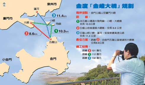 根據(jù)金門縣府初步規(guī)劃,金嶝大橋有三案,甲案由金門縣五龍山經(jīng)大陸角嶼、小嶝島,銜接至大嶝島,全長10.3公里;乙案由五龍山,直接連到大嶝島,全長8.6公里,距離最短;丙案由五龍山,銜接泉州市的蓮河地區(qū),全長11.4公里。