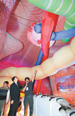 記者先走入“格列佛人體藝術(shù)探索館”一探究竟,從巨大的腳掌進(jìn)入,首先映入眼簾是大腿骨和腳掌骨,充滿普普藝術(shù)的彩繪風(fēng)格;創(chuàng)意團(tuán)隊(duì)將小腸化身為L(zhǎng)ED燈的迷宮隧道,還能看到跳動(dòng)的心臟,利用氣球制造肺部呼吸頻率,栩栩如生。