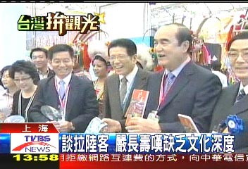 臺灣觀光協(xié)會要嚴(yán)長壽帶領(lǐng)金門連江宜蘭花蓮到上海,營銷臺灣旅游,面對先前北京喊出百萬人游臺,嚴(yán)長壽感嘆,光喊拉大陸客的口號不夠,臺灣拼觀光還是缺乏文化深度。