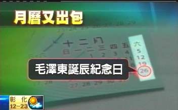 這份2009年的月歷,仔細(xì)看,10月1日是大陸的國(guó)慶節(jié),這月歷卡又用紅色特別標(biāo)示,此外,12月這一排星期六都是黑色字體,偏偏26日“紅通通”,一查,這可是毛澤東誕辰紀(jì)念日,但這回發(fā)生在臺(tái)涉外部門東部辦事處。