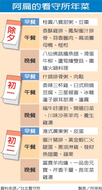 臺北看守所指出,他們?yōu)椴荒芑丶疫^年的收容人在春節(jié)加菜,在除夕,陳水扁可以吃到的年菜,有八仙魚翅佛跳墻、滑蛋牛柳、蘆筍燴雙菇、圍爐火鍋料湯等,還有香酥雞排、菠蘿蜜汁排骨、蒜香臘肉、麻 油姜母鴨湯及水果椪柑等。