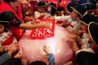 小朋友們邊搓湯圓,邊念吉祥話,要大家一起“搓圓圓、賺大錢”“團(tuán)團(tuán)圓圓大吉大利”。