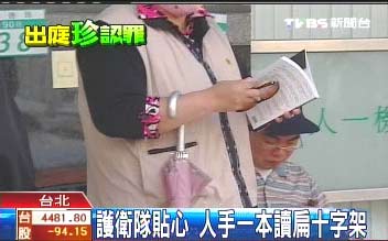 陳幸妤抵達前,護衛(wèi)隊先測試道具靈活性,雨傘開開合合,再來開始研讀阿扁的十字架。一個大袋子,是不是都裝阿扁的“十字架”不知道,但護衛(wèi)隊關(guān)心扁家,不只保護陳幸妤,連陳水扁的心情筆記都要研究透徹,真的太窩心。