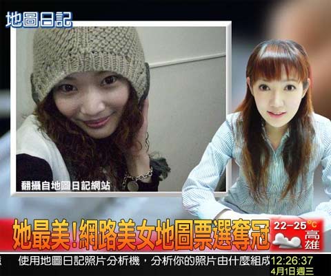 “想知道誰(shuí)是臺(tái)灣最美的女性嗎?地圖日記網(wǎng)站日前舉辦美女票選,活動(dòng)一個(gè)月就突破千萬(wàn)的瀏覽率…”,玄藏大學(xué)大三生劉伊珊一周前上傳自拍照片,制成網(wǎng)絡(luò)美女票選奪冠的頭條新聞,沒想到還成功騙倒兩個(gè)同學(xué)。劉伊珊說,當(dāng)初只是想給同學(xué)一個(gè)驚喜,竟還有同學(xué)看到之后問,“你真的上電視喔?”