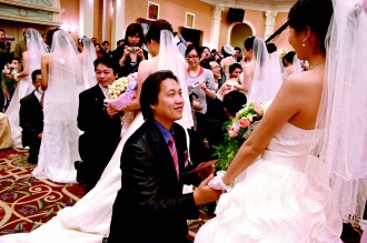 中新網(wǎng)4月16日電 據(jù)臺灣《聯(lián)合報》報道,花蓮縣15日在舉辦集體結(jié)婚,全縣100對新人完成終身大事,有日本郎娶臺灣美嬌娘,也有佛教醫(yī)院人員娶基督教醫(yī)院護士,新人在微微的細(xì)雨中走過許愿池,誓言情愛一生。