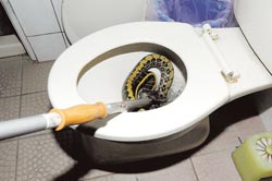 中新網(wǎng)5月11日電 一朝被蛇咬,十年怕馬桶?據(jù)臺(tái)灣《中國(guó)時(shí)報(bào)》報(bào)道,住南投埔里鎮(zhèn)山區(qū)的林姓男子,日前坐馬桶小解時(shí),突感下體一陣劇痛,回頭赫見(jiàn)一條巨蛇躲在馬桶里昂首吐舌信,咬破他的陰囊鮮血直流,趕緊負(fù)傷求助鄰人送醫(yī);醫(yī)生說(shuō)所幸黑眉錦蛇無(wú)毒,否則連小命也不保。