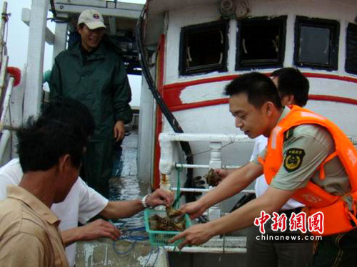 中新網(wǎng)惠安6月15日電 (林永傳 郭斌 陳群峰)“嗯……好吃,跟臺灣的口味差不多,謝謝你們邊防民警……”15日,福建崇武邊防派出所官兵為來轄區(qū)港口靠岸避風雨的19名臺胞送上了“閩南肉粽”,受到了臺胞的熱烈歡迎。