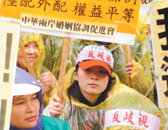 諷刺的是,現(xiàn)在臺灣上下只想賺大陸人的錢,挹注臺灣頹圮的經(jīng)濟?膳_灣社會有善待人家的女兒嗎?政策不公無形中增加大陸配偶的高離婚率。