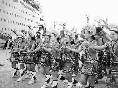13日,安利團(tuán)員乘坐的郵輪停靠花蓮港口。早晨7時(shí),已經(jīng)有花蓮原住民阿美族的姑娘小伙身著盛裝,在港口用歌聲和舞蹈歡迎大陸來(lái)的客人。