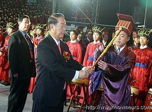 中新網(wǎng)9月27日電 2009年第二屆中華文化快車兩岸師生聯(lián)合祭孔大典今日上午在新竹隆重登場(chǎng),祭孔大典更開創(chuàng)先例,透過(guò)因特網(wǎng)同步同時(shí)在新竹、北京、山東三地聯(lián)合進(jìn)行,萬(wàn)余名兩岸師生共同參與。親民黨主席宋楚瑜更第二度應(yīng)邀擔(dān)任祭孔大典正獻(xiàn)人,這也是近60年以來(lái),臺(tái)灣民間祭孔規(guī)模最大的一次集會(huì)。