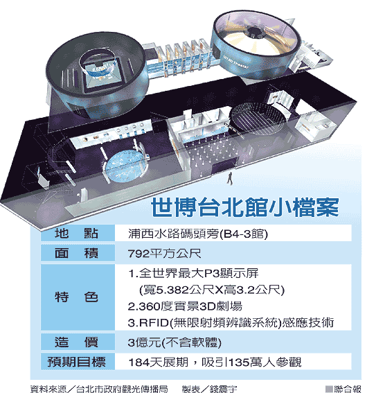 世博會臺北館館長陳慶安表示,館內(nèi)一次開放84人參觀,全程參觀時間36分,以一天開放13個小時計(jì)算,約有2184人參觀。臺北館預(yù)計(jì)4月16日完工驗(yàn)收,4月20日開放試營運(yùn)。