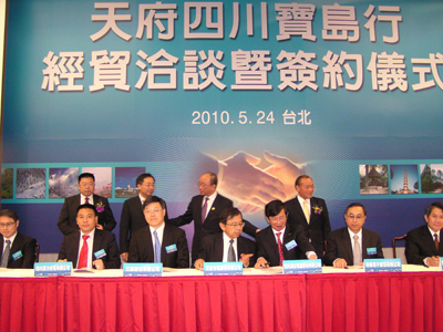 四川省工業(yè)經(jīng)濟(jì)聯(lián)合會與工業(yè)總會、臺灣區(qū)電機(jī)電子工業(yè)同業(yè)公會等川臺經(jīng)貿(mào)、旅游、農(nóng)業(yè)、文化團(tuán)體,上午共簽署5份合作協(xié)議!百Q(mào)協(xié)”下午在臺北國際會議中心舉辦川臺采購洽談會,預(yù)計(jì)安排上百場1對1洽談。