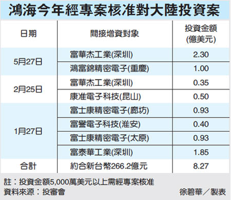 中新網(wǎng)5月28日電 據(jù)臺灣《經(jīng)濟日報》報道,臺當(dāng)局“經(jīng)濟部”投審會昨(27)日通過兩件鴻海集團對大陸增資案,總計3.3億美元,約新臺幣106.2億元。一件是間接對富華杰工業(yè)(深圳)增資2.3億美元,另一件是對鴻富錦精密電子(重慶)間接增資1億美元。