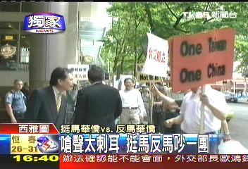 而飯店里的挺馬僑胞也不停在喊支持口號(hào),才讓馬英九開心地笑了,挺馬僑胞的歡呼聲一時(shí)間蓋過(guò)了場(chǎng)外的嗆聲。而反馬僑胞仍舊拼命表演,手上高舉“ONE TAIWAN ONE CHINA”的“臺(tái)獨(dú)”標(biāo)語(yǔ),徹底惹毛了飯店2樓的挺馬僑胞,忍不住沖下了樓,戰(zhàn)火一觸即發(fā)。