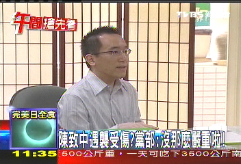 中新網(wǎng)7月22日電 據(jù)臺灣媒體報道,目前在民進黨高雄市黨部負(fù)責(zé)法律咨詢的陳致中,傳出在處理一件案子時,因委托人雙方發(fā)生爭吵,出面勸架的陳致中被抓到滿身傷,黨部主委出面表示,當(dāng)時該對夫妻的確大吵了一架,但沒有動手動腳。
