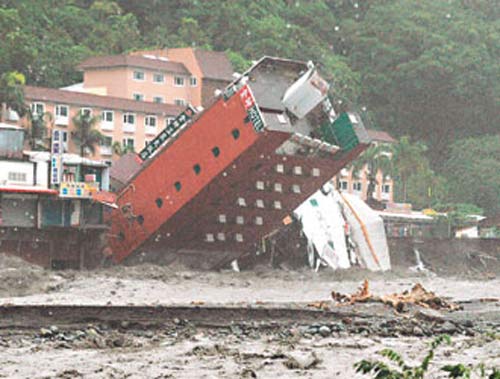 有二十二年歷史的金帥飯店昨天中午十一時(shí)三十八分,不敵激濁的山洪,在對(duì)岸圍觀群眾驚叫聲中,瞬間倒入知本溪中,附近十棟民宅與商店也被沖走。海岸山脈另一頭的紅葉溫泉全部被埋在土石流里,還好當(dāng)?shù)刂挥袦厝O(shè)施,沒(méi)有飯店,不然不堪設(shè)想。