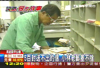 中新網(wǎng)8月19日電 高雄縣甲仙鄉(xiāng)小林村一夕之間滅村,甲仙郵局有一位專跑小林村的老郵差劉昭學,他送信到小林村已經(jīng)有30多年,但臺風到現(xiàn)在,累積成堆的小林村郵件,已經(jīng)2大箱,大約500多封信如今成了無法投遞的郵件,老郵差滿是遺憾和不舍。