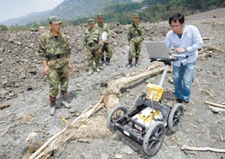 搜救人員表示,今天會(huì)再運(yùn)送兩臺(tái)儀器到小林村幫組搜尋,因?yàn)?zāi)難發(fā)生當(dāng)時(shí)很多人在屋內(nèi),故會(huì)先用儀器探測(cè)找出房舍再開挖。他們介紹儀器說(shuō),“電磁波探測(cè)儀”用來(lái)找尋地面下的石油、探礦,探測(cè)深度達(dá)十米;“透地雷達(dá)”則是發(fā)射雷射波,探測(cè)地面下是否有物體存在。