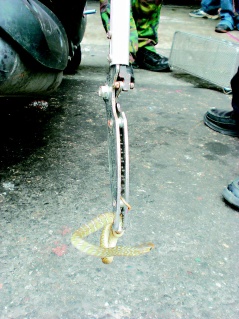 一起停等的騎士看了都嚇了一跳,要王婦把車推到武陵派出所,請警員幫忙抓蛇;她直奔派出所,但警員不諳抓蛇,再請來消防隊(duì)員幫忙。
