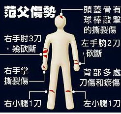 范姓少年一開(kāi)燈、林就持鋁棒重?fù)羰焖械姆陡割^部,連續(xù)敲打四、五下;范見(jiàn)父親抱頭抵擋,即持西瓜刀朝他身上一陣猛砍,因用力過(guò)猛,連刀柄都砍斷了,直到父親不支倒地才罷手。