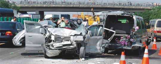 中新網10月16日電 據(jù)臺灣《聯(lián)合報》報道,臺灣中山高彰化路段十五日發(fā)生四死五傷重大車禍,一輛滿載丁烷的化學槽車,前晚近十時為閃避爆胎前車翻覆,北上車道大塞車至昨天近中午時,一輛客運從后方高速沖撞車陣,連環(huán)撞爛十四輛車,現(xiàn)場慘不忍睹。