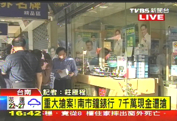 中新網(wǎng)11月23日電 據(jù)臺(tái)灣TVBS報(bào)道,臺(tái)南市一家鐘表行老板,23日下午到銀行提領(lǐng)新臺(tái)幣7000萬(wàn)元現(xiàn)金,準(zhǔn)備買(mǎi)黃金用,沒(méi)想到回家途中遭歹徒尾隨,回到店內(nèi)時(shí)歹徒開(kāi)槍搶走現(xiàn)金,流彈還意外波及在店內(nèi)的老板侄女,侄女小腿中彈,送往成大醫(yī)院急救,歹徒則逃逸無(wú)蹤。