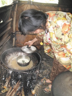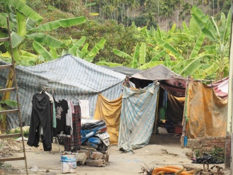 簡(jiǎn)陋破落帳篷搭在香蕉園里,卓姓夫妻與兒子擠在不到兩坪的空間里;室內(nèi)堆放著臟亂衣物等用品,睡覺的地方用木板稍隔開,陳設(shè)比起工寮還要簡(jiǎn)陋。緊鄰廚房?jī)H有一只燒柴鍋?zhàn)樱考遗魅隋佔(zhàn)诱谡舻,蒸蛋的水暗沉,她說(shuō):“這是早餐!