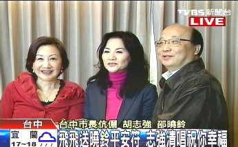 中新網(wǎng)1月29日電 據(jù)臺(tái)灣TVBS報(bào)道,帽子天后鳳飛飛為了明天演唱會(huì),29日下午提前到臺(tái)中和市長(zhǎng)胡志強(qiáng)、市長(zhǎng)夫人邵曉鈴進(jìn)行一場(chǎng)敘舊茶會(huì)。