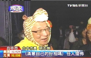 臺(tái)中市長胡志強(qiáng)扮成老虎,并圍上一條“老虎圍巾”,所有參加臺(tái)中燈會(huì)的貴賓坐在位子上整齊劃一,不論穿的是西裝還是休閑服,都在脖子上加了條亮黃色圍巾……這是臺(tái)中市府的創(chuàng)意,圍巾左右兩邊是老虎尾巴,做成英文字母T,代表臺(tái)中Taichung,還有老虎Tiger。