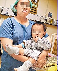 她從銀行回來后,見兒子坐在報(bào)紙堆上不敢下來走動(dòng),下午五時(shí)幫兒子換尿布才發(fā)現(xiàn)兒子雙腳腳掌都起大水泡,趕緊將兒子送到高雄長庚醫(yī)院急救,被診斷有二至三度燙傷,轉(zhuǎn)入燒燙傷病房,至少需住院一周。