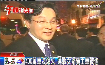 中新網(wǎng)5月1日電 據(jù)臺灣TVBS報道,國民黨榮譽(yù)主席連戰(zhàn)的女婿、連惠心丈夫陳弘元的奔馳車被偷,消息也登上新聞版面。陳弘元是和妹妹到新竹拜訪易經(jīng)老師,司機(jī)趁空檔,到超商繳費(fèi)而沒熄火的時候,原價400多萬的奔馳車,被歹徒乘機(jī)偷開走。