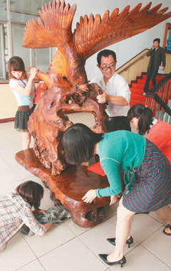 就在貓媽咪跳上窗臺時,院檢人員們聽到躲在老鷹木雕座下方小貓咪瞇喵喵叫,望往窗臺上貓媽咪悲憐眼神,大伙決定展開救貓行動,只見檢察官、法官叔叔阿姨們,費盡力氣搬起五噸重大木雕“救出來沒,趕快……”。