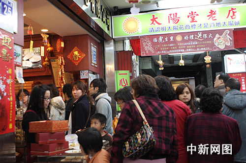 中新網(wǎng)臺(tái)中2月22日電 (屈運(yùn)栩)初到臺(tái)中的人,一定會(huì)被路兩旁零次櫛比,目光應(yīng)接不暇的“太陽(yáng)堂”招牌和店鋪吸引。店鋪里售賣的太陽(yáng)餅是臺(tái)灣最有代表性的特產(chǎn)。春節(jié)剛過(guò),記者走訪了臺(tái)中太陽(yáng)餅老店鋪?zhàn)罴械淖杂陕,看到各間老餅鋪前都排起長(zhǎng)隊(duì),一片生意興隆景象。