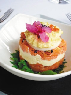 春秋烏來(lái)渡假酒店也在櫻花季節(jié)推出櫻花季套餐,用櫻花入菜,像櫻花煙熏鮭魚(yú)塔,以煙熏鮭魚(yú)加入洋蔥碎、酸豆及日本四季紅,中間夾入酸奶與奶油起司泥,酸甜可口,新推櫻花甜點(diǎn)也很有特色。