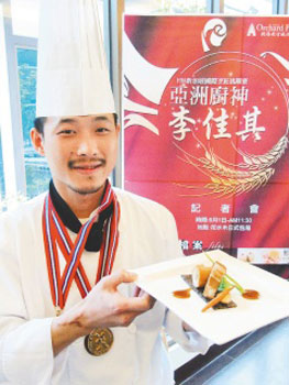 李佳其另外用豬肉當(dāng)食材,以鹵、炸、烤做成“懷舊新三味”,獲得新亞洲風(fēng)味料理金牌;另以香魚、草蝦、中卷等做成的“三冷三熱展示開胃菜”拿銅牌。