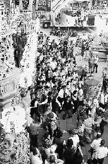 興濟(jì)宮還專設(shè)“宴王”,給予圣駕最高禮遇。數(shù)十平方米的大桌上有大龍蝦、烤乳豬等過百道各色食品。當(dāng)?shù)貙W(xué)生葉升融說起桌子正中最醒目的“山珍海味”,如數(shù)家珍,“用姜堆成的是‘山’,下面鋪著的紅豆綠豆代表了‘珍’,雪白的鹽就是‘!,‘味’則用紅糖表示。”他對(duì)著“宴王”不斷按動(dòng)快門,說晚上就把照片傳到部落格上,和朋友們一起分享。 (記者 鄭璜 通訊員 林廣明)