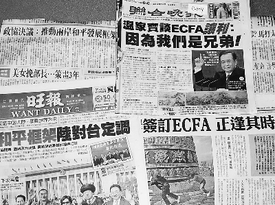 今天下午出版的《聯(lián)合晚報》在頭版頭條以《溫家寶談ECFA讓利:因為我們是兄弟》為題,圖文并茂報道了全國人大閉幕和溫家寶總理的記者會!堵(lián)合報》特派記者汪莉絹因為在記者會上向溫總理提出了有關(guān)兩岸的問題,溫家寶總理對此進行了詳細解答,為此引發(fā)了島內(nèi)媒體的廣泛報道和熱烈討論!堵(lián)合晚報》還在第二版幾乎用了整版,進行相關(guān)報道。