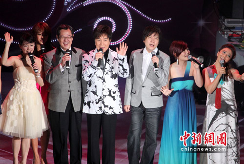 5月8日,一代巨星鄧麗君逝世滿15周年,“但愿人長久—鄧麗君金曲慈善演唱會”當晚在臺北登場,14位老中青實力派歌手演繹35首鄧麗君不同時期的經(jīng)典歌曲,令數(shù)千觀眾聽得如癡如醉。圖為演唱會尾聲,馬來西亞著名歌手梁靜茹(右2)、曾與鄧麗君搭檔的臺灣老歌手謝雷(左3)、“寶島閩南語歌王”洪榮宏(右3)、“小鄧麗君”蔡幸娟(左1)等人合唱《Goodbye My Love》。中新網(wǎng)駐臺記者 董會峰攝
