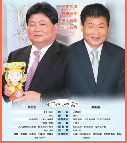 他說,“阿標減肥秘方”是“運動加倍、食量減半、意志要強、決心要夠”四句箴言,愿獻給全臺的胖哥、胖嫂。