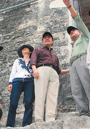 中新網(wǎng)6月1日電 據(jù)臺灣《聯(lián)合報》報道,馬英九訪問中美洲已經(jīng)六天。馬英九夫婦被安排參觀危地馬拉提卡爾公園的馬雅遺址,輕松爬上數(shù)百階的神廟,當(dāng)團員問馬英九“累不累?”沒想到一旁的“酷酷嫂”周美青插話說“他什么都沒做,怎么會累!”