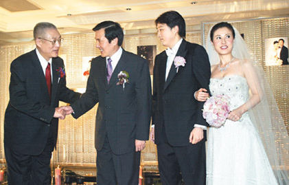 中新網(wǎng)6月15日電 據(jù)臺灣《聯(lián)合報》報道,國民黨秘書長吳敦義次子吳子文14日在臺北舉行結(jié)婚酒會與女方歸寧宴,馬英九、“行政院長”劉兆玄、“立法院長”王金平、國民黨主席吳伯雄等黨政高層出席致賀,現(xiàn)場冠蓋云集。