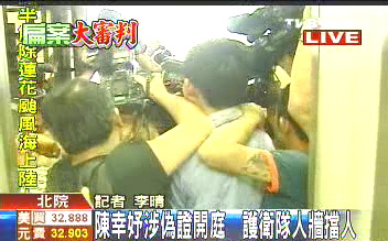 護(hù)衛(wèi)隊(duì)作風(fēng)強(qiáng)悍,組成人墻,用雨傘一路護(hù)著陳幸妤,不讓媒體拍到陳幸妤的表情,躲在雨傘下、戴著漁夫帽的陳幸妤,似乎被雨傘戳到臉,表情不悅,一度不耐、吼叫出聲,而開庭結(jié)束離開時(shí),又再次爆發(fā)沖突,目前趙建銘正在接受偵訊當(dāng)中。