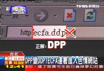 中新網(wǎng)7月2日電 據(jù)臺灣TVBS報道,兩岸經(jīng)濟架構(gòu)協(xié)議(ECFA)在島內(nèi)引起爭議,民進黨表達(dá)抗議發(fā)起ECFA“公投”聯(lián)署。只是宣傳ECFA“公投”的網(wǎng)站,現(xiàn)在卻被發(fā)現(xiàn)出現(xiàn)山寨版,網(wǎng)址民進黨的英文縮寫DPP變成DDP,一點進去竟然是露點色情網(wǎng)站,民進黨當(dāng)然尷尬。