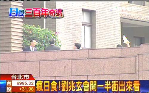 中新網(wǎng)7月22日電 據(jù)臺(tái)灣媒體報(bào)道,盡管臺(tái)灣只能看到日偏食,但民眾“追日”熱情高漲,政治人物也不例外。臺(tái)當(dāng)局“行政院長(zhǎng)”劉兆玄與副手邱正雄等人今天上午在辦公室開會(huì),剛到一半就沖到二樓陽臺(tái)看熱鬧。